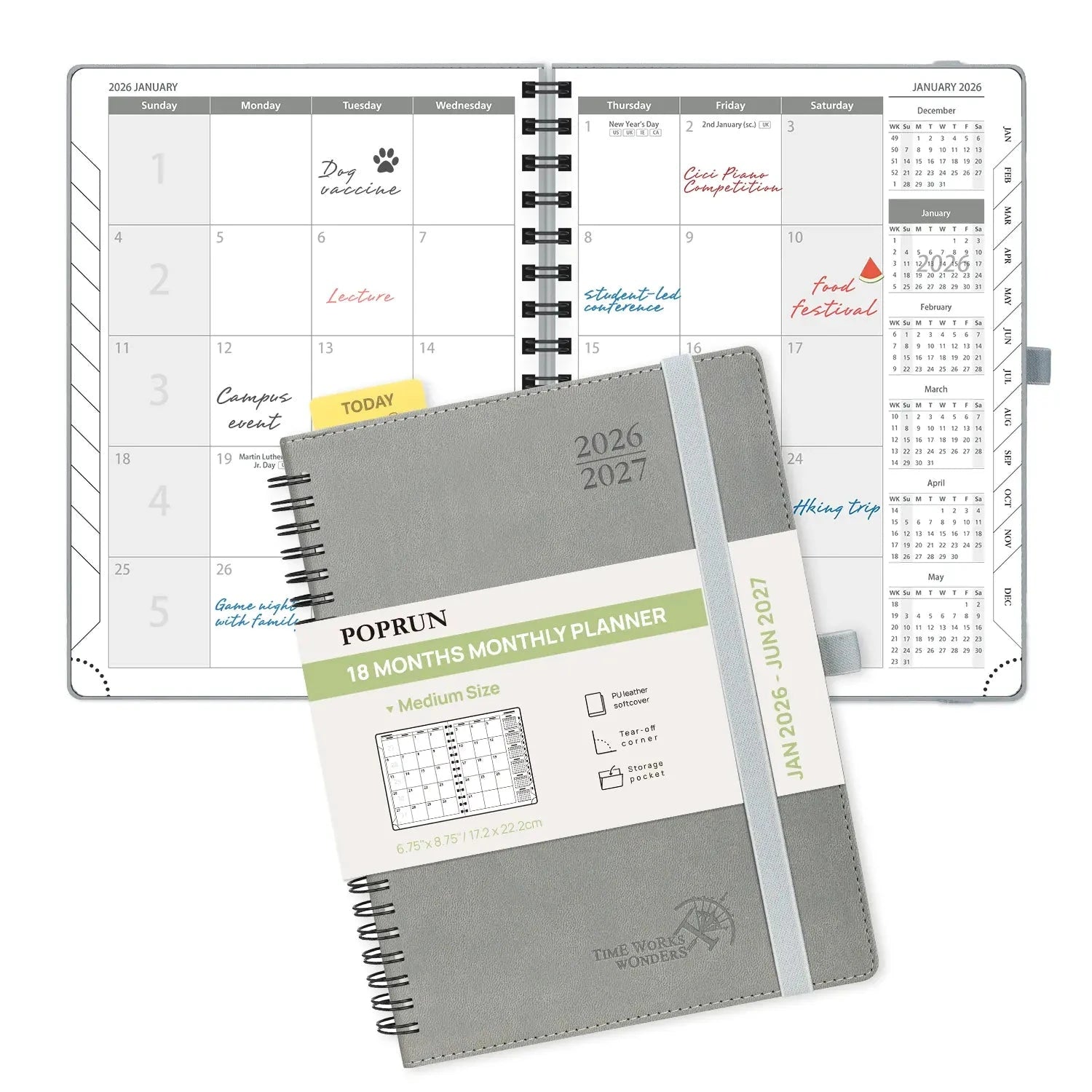 POPRUN 18 Month – Softcover Monthly planner Maximize productivity and reach your potential with our 2026 Monthly Planner! With 18 months of planning, you’ll have ample space to organize your goals and tasks through the weekly and monthly views. This personalized planner is the ultimate tool for reducing stress and promoting self-discipline in all aspects of life. Whether it’s work, family, or personal endeavors, our planner will be your faithful ally. Description Model: WEMLO7-26 Year: Jan. 2026-Jun. 2027 Format: Monthly Binding: Spiral Layout: Vertical, 2 pages per month Cover: Soft Cover Page Size: 6.5×8.5 in / 21.5×17.3 cm Bonus Features: Built-in “Today” ruler for easy measurement and drawing Paper Weight: The inner pages are 100gsm
