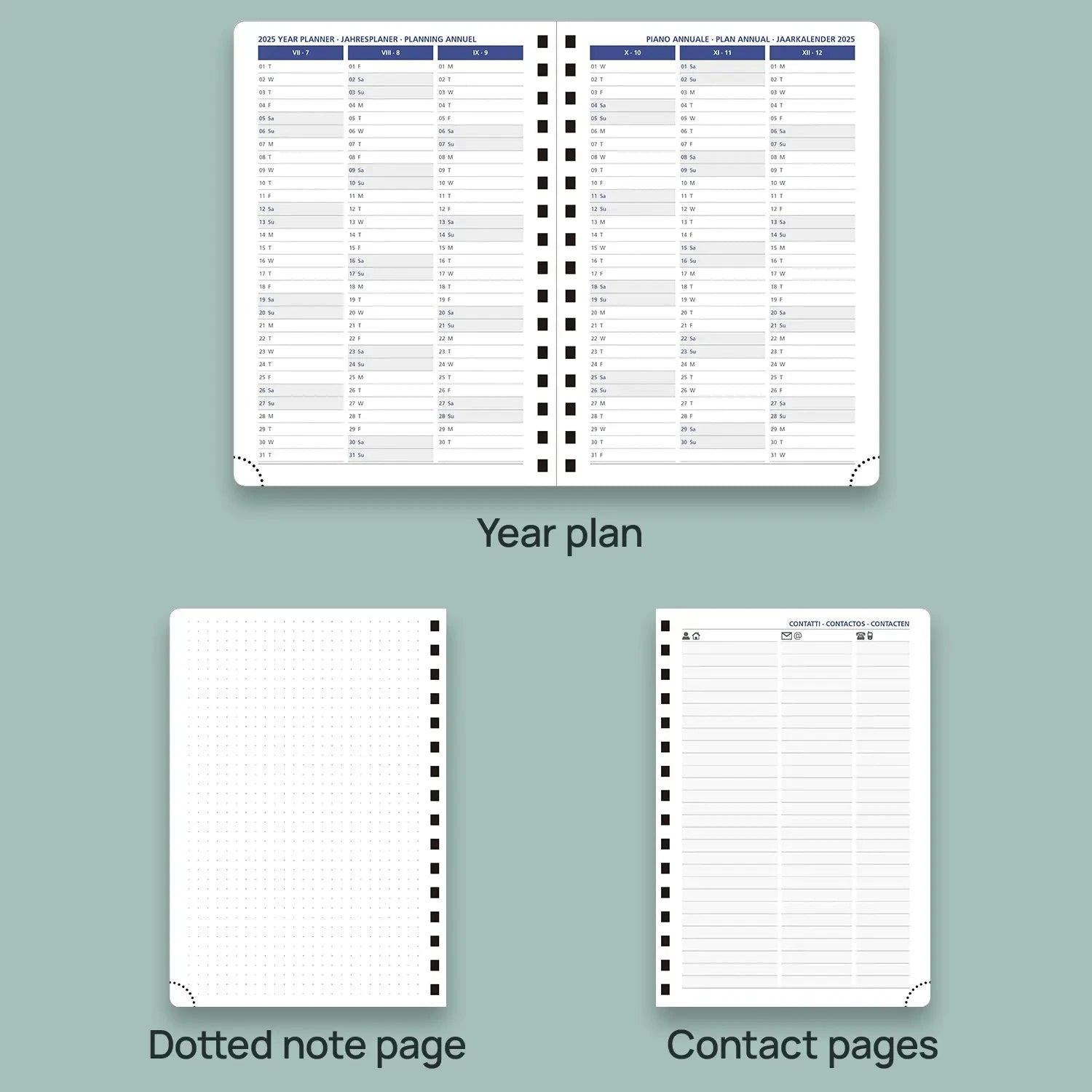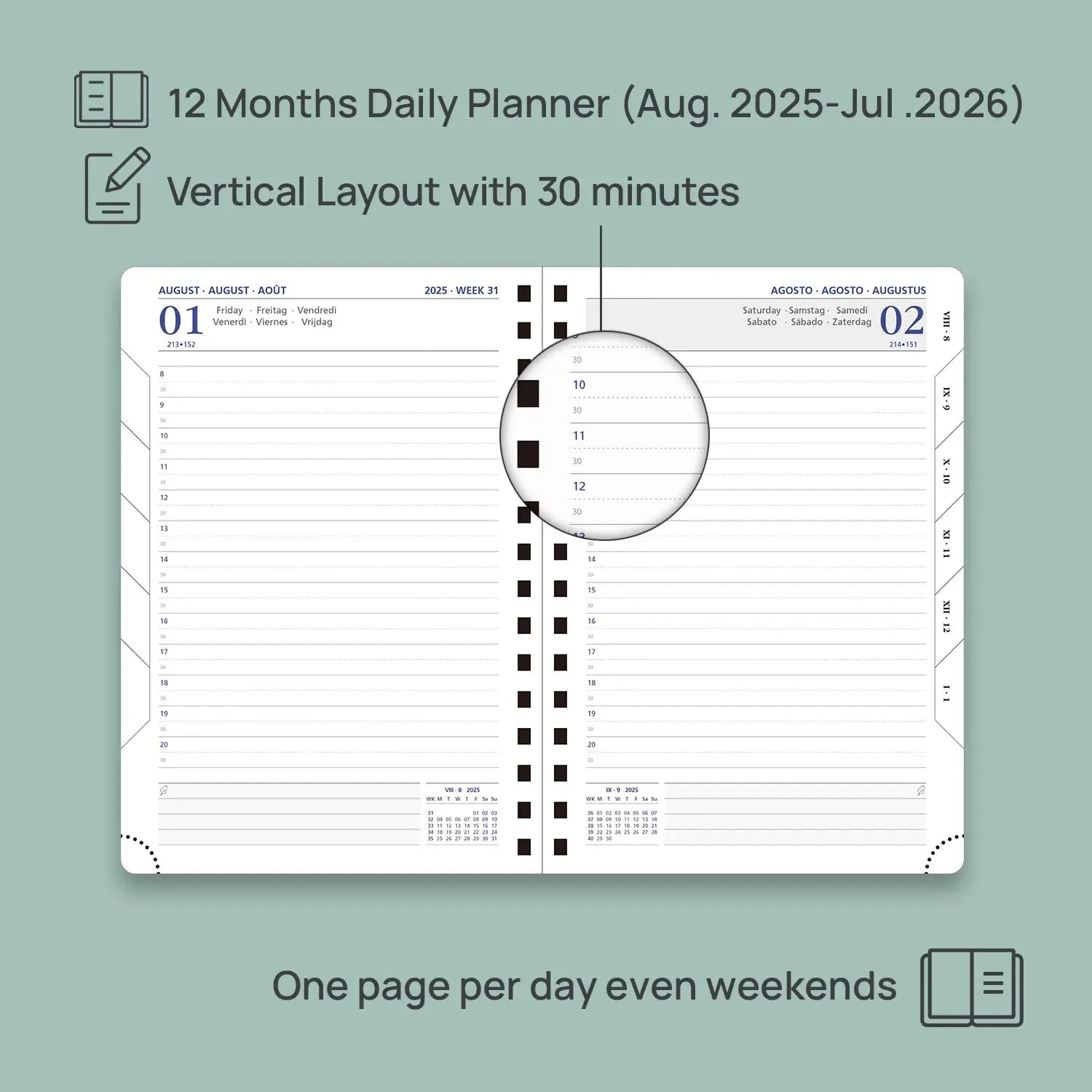 POPRUNย 12 Month –ย Hardcover Daily Academic planner Our 2025-2026 Academic Planner is a necessary tool for students. Beginning in August and spanning 12 month until July of the following year, this planner will keep you organized every day. With ample space on each page to record study progress, course schedule, assignments, and important tasks, you can fine-tune your daily planning and effortlessly manage your time. No more missed deadlines or lost focus – this planner will guide you towards academic success. Description Model: AW6LEDA5-26 Material: Faux Leather ONE PAGE PER DAY EVEN WEEKENDS: This daily planner ( August 2025- July 2026) features 365 daily pages from 8:00 a.m. to 8:00 p.m with a 30-minutes interval,which presents spacious everyday planning with hourly schedules for your appointments. A5 MEDIUM SIZE: The size of this 2025-2026 daily planner is 21.5 x 14.5 cm,slightly smaller than a flat panel,comfortable to carry and use,which makes your busy daily routines organized. QUICK SEARCH FUNCTION: The monthly tabs and tear-off page corners allow you to quickly browse and locate the current day. Besides, a bookmark ribbon is added to mark any wanted page of your choice. EXTRA PAGES: This 2025-2026 daily planner also contains “2025-2026 Yearly Overview” Page + “2025-2026 Holiday & Calendar” Page + Contact Pages + Password Page + Dotted Notes Pages for jotting down your ideas, thoughts or any other happy things in detail. HIGH QUALITY PAPER – The use of premium 80GSM acid-free ivory paper, makes it silky smooth to write on and ink resistant, bringing you the ultimate writing experience. FSC Certification: The use of ecological paper from sustainable forests and our compliance to European Community Regulation on chemicals and their safe use are our commitment to the environment