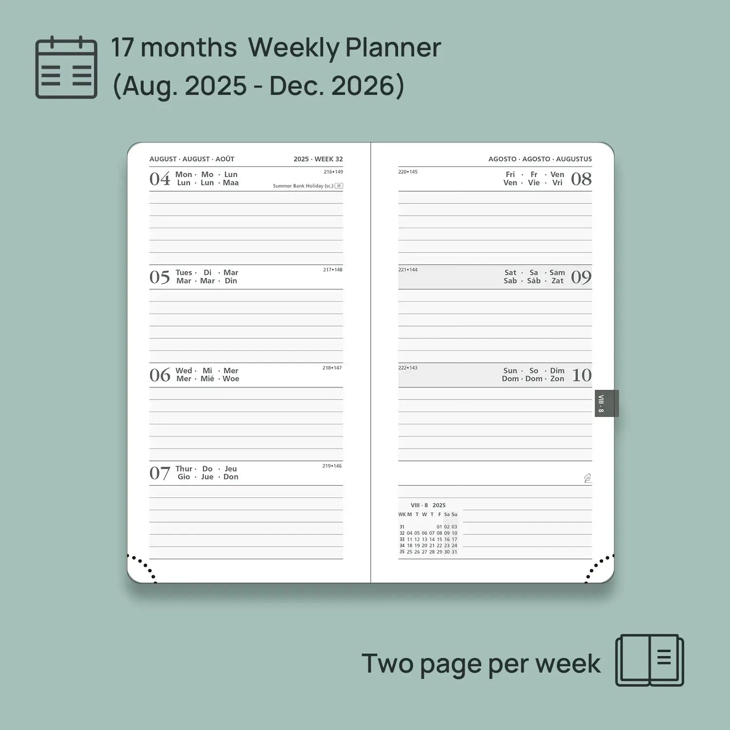 Β 17 Month – Hardcover Weekly Academic planner Stay organized with the POPRUN 2025β2026 Academic Planner β an 17-month organizer from August 2025 to December 2026. Perfect for back-to-school, semester planning, and long-term projects, it keeps students, professionals, and creatives focused with one continuous tool for success. Description Model: AC6HTP7-26 2 PAGES PER WEEKοΌLay flat week-to-view on 2 pages, this weekly planner (Aug.2025 to Dec. 2026) presents spacious everyday planning for your appointments, which makes your busy daily routines organized. QUICK SEARCH FUNCTION: Easy-track corners allow you to quickly navigate and locate the current day. In addition, two bookmark tapes are added to mark any desired page of your choice. EXTRA PAGES: This 2025-2026 weekly planner also contains “2025-2026 Yearly Overview” Page + “2025-2026 Holiday & Calendar” Page + Contact Pages +Password Page + Dotted Notes Pages for jotting down your ideas, thoughts or any other happy things in detail. Thick Paper: The use of premium 80GSM acid-free ivory paper, makes it silky smooth to write on and ink resistant, bringing you the ultimate writing experience FSC Certification: The use of ecological paper from sustainable forests and our compliance to European Community Regulation on chemicals and their safe use are our commitment to the environment