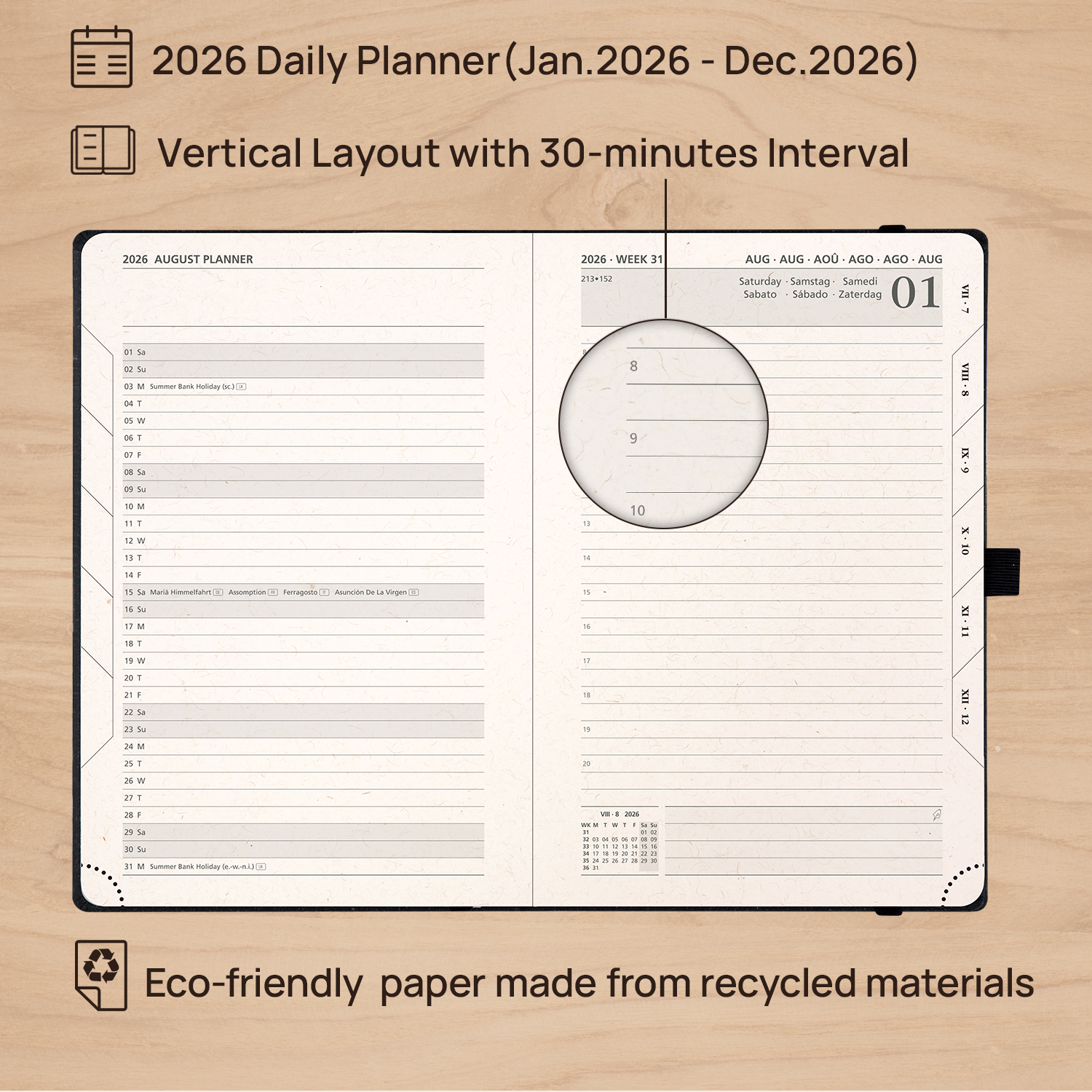 POPRUN 12-Month Hardcover Daily Planner Keep your work and personal life in balance with our 12-month daily planner. It features a clear daily layout that allows you to efficiently plan your daily tasks and goals, whether for work or personal matters. The day view gives you a quick overview of your daily to-do list, while the 12-month planner view helps to schedule long-term activities and goals. This planner is designed to keep you organized even with a busy schedule. Model: C6RBTA5-26 Year: Jan.-Dec. 2026 Format: Daily Cover: Hard Cover Binding: Casebound Size: 8.66×6.1 in / 22×15.5 cm Layout: Vertical, 1 page per day Paper Weight: The inner pages are 100gsm Start Every Day with Clarity & PurposeLife doesn’t slow down—but with the right planner, you can keep up while staying grounded. The POPRUN 12-Month Daily Planner (January–December 2026) is designed to balance work, personal life, and everything in between. With one full page dedicated to each day—including weekends—you’ll have the space to map out appointments, track goals, and capture ideas without feeling crowded.