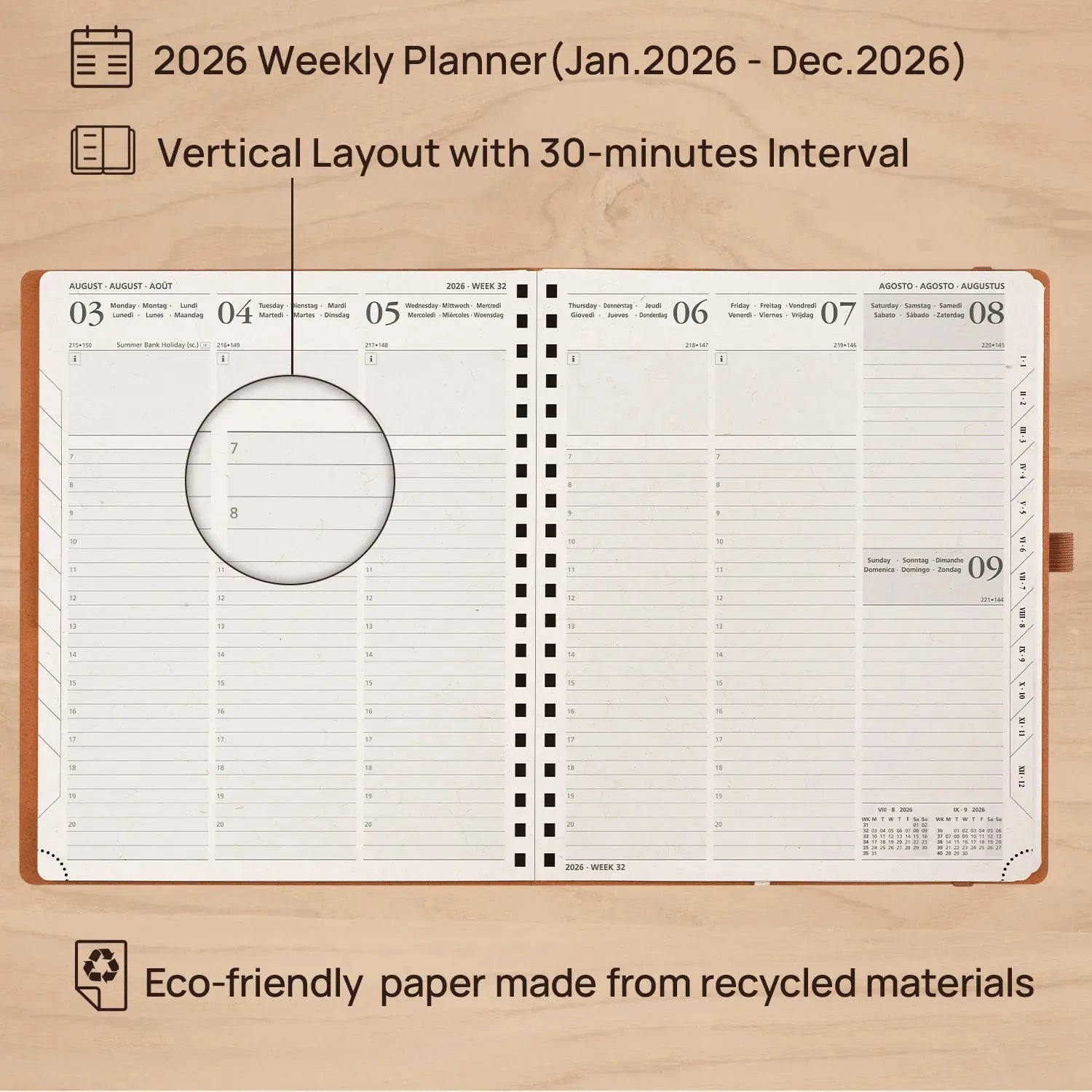 POPRUN 12-Month Hardcover Weekly Planner Experience a year of perfect planning with our 12-month planner. Designed to help you manage your daily tasks, long-term goals, and important matters, this planner offers monthly, daily, and weekly layouts to record meetings, tasks, and personal activities. Stay organized and in control with ease as you work, study, or live your life with this efficient and well-organized time management tool. Model: W6RK7-26 Year: Jan.-Dec. 2026 Format: Weekly Cover: Hard Cover Binding: Spiral Size: 10.5×8.5 in / 26.5×21.5 cm Layout: Vertical, 2 pages per week Bonus Features: Built-in “Today” ruler for easy measurement and drawing Paper Weight: The inner pages are 100gsm Start 2026 with clarity and confidence. The POPRUN Weekly Planner is more than just a schedule—it’s your space to map out goals, balance work and life, and create meaningful moments throughout the year. With a classic hardcover design and durable spiral binding, this planner is built for everyday use—whether you’re in the office, at school, or managing family life from home.