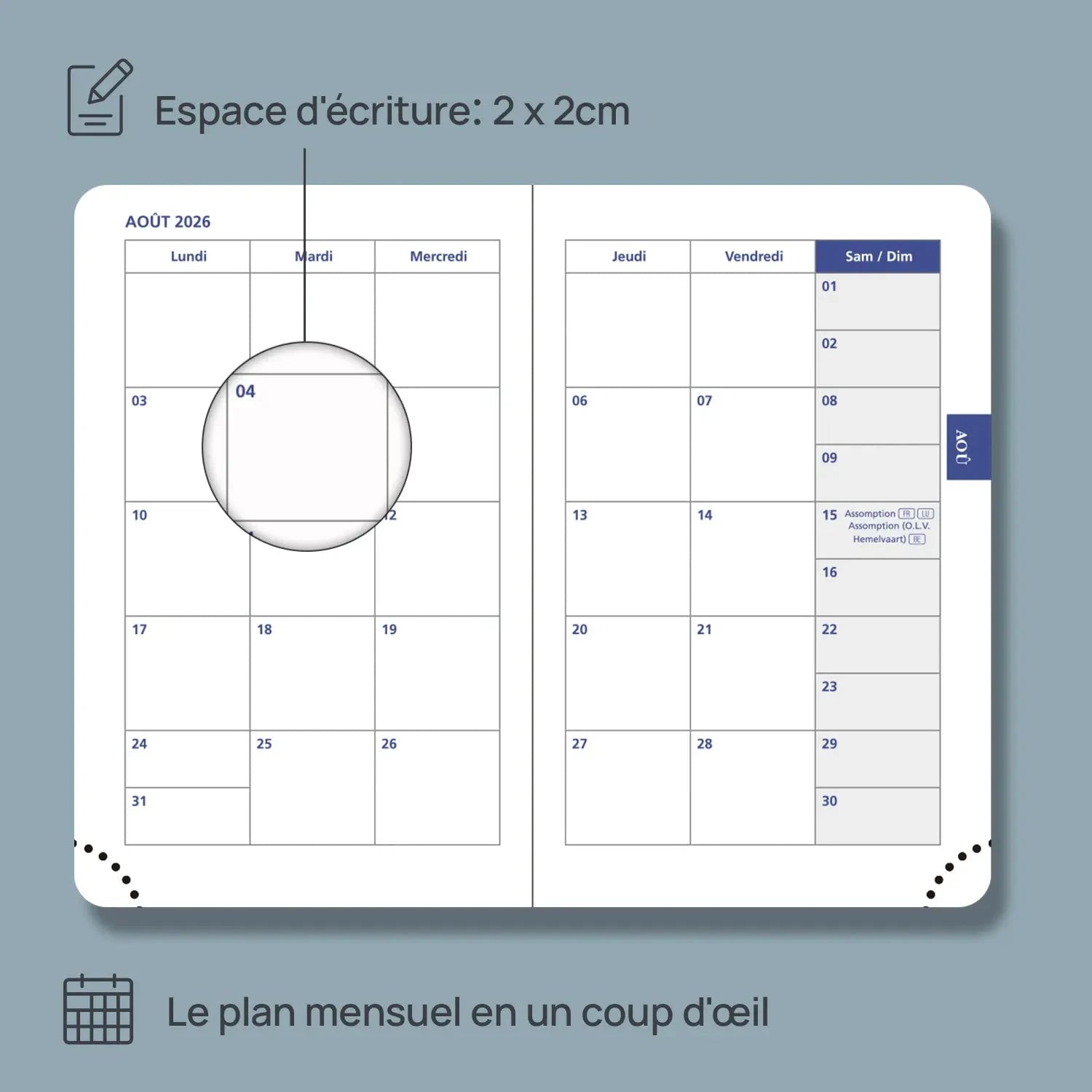 POPRUN 12 Month – Softcover Weekly And Monthly Planner Experience a year of perfect planning with our 12-month planner. Designed to help you manage your daily tasks, long-term goals, and important matters, this planner offers monthly, daily, and weekly layouts to record meetings, tasks, and personal activities. Stay organized and in control with ease as you work, study, or live your life with this efficient and well-organized time management tool. Description Model: CFLA7-26 Year: Jan.-Dec. 2026 Language: French Format: Weekly Binding: Casebound Layout: Vertical, 2 pages per week Cover: Soft Cover Size: 11.5cm x 7.5cm Paper Weight: The inner pages are 70gsm