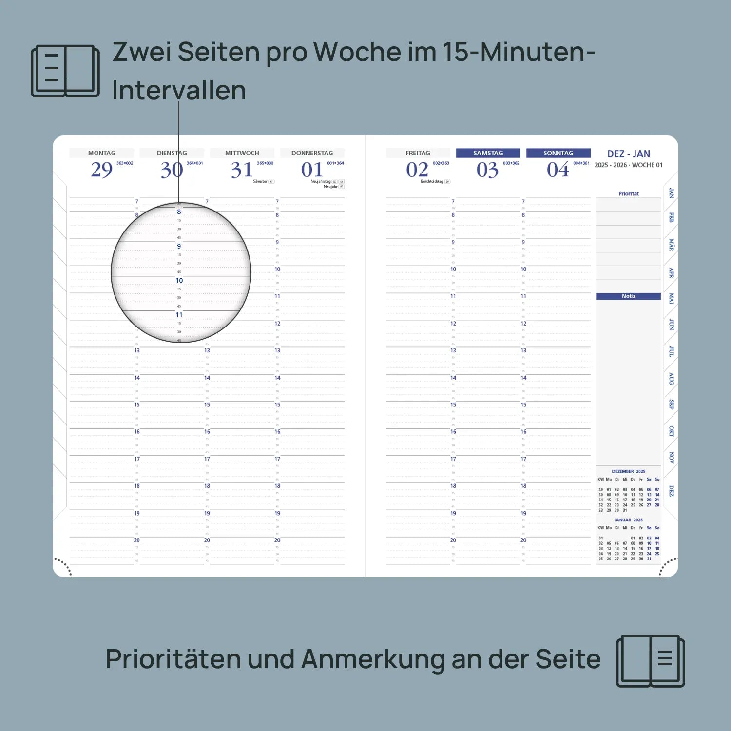 POPRUN 12-Month Softcover Weekly Planner Keep your work and personal life in balance with our 12-month weekly planner. Covering January to December 2026, it features a clear weekly layout that helps you efficiently organize tasks, goals, and appointments, whether for work or personal matters. The week-at-a-glance view gives you structured oversight of your priorities, while the 12-month planner view supports long-term planning. Designed for busy schedules, this planner keeps you focused, prepared, and always in control. Model: CDLU7-26 Year: Jan.-Dec. 2026 Language: German Format: Weekly Cover: Soft Cover Binding: Casebound Size: 29.7cm x 21cm Layout: Vertical, 2 pages per week Paper Weight: The inner pages are 100gsm Make space for what matters most.When life is packed with deadlines, meetings, classes, and family commitments, clarity is everything. The POPRUN 12-Month Softcover Weekly Planner is designed to give you room to breathe and structure to thrive. Covering January to December 2026, this large-format planner offers the space and flexibility you need to organize every detail—without feeling overwhelmed. With its week-at-a-glance vertical layout, you can map out your days in 15-minute intervals from early morning to evening. Whether you’re scheduling appointments, blocking study time, or carving out moments for yourself, this planner helps you find balance in the busiest of seasons.