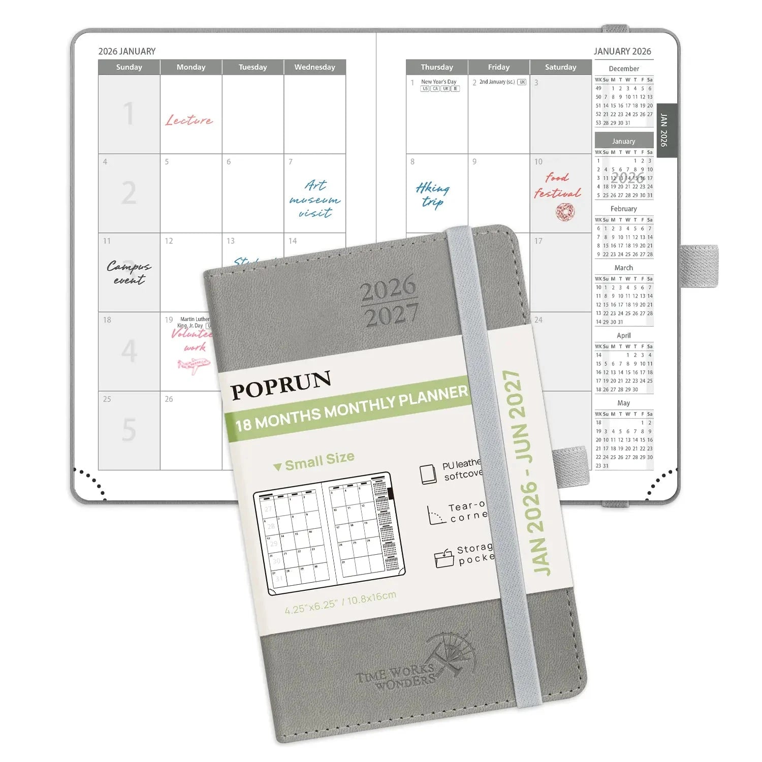 POPRUNย 18-Month Softcover Monthly Planner Keep your work and personal life in balance with our 18-month monthly planner. Covering January 2026 through June 2027, it provides a clear monthly layout to efficiently map out long-term goals, important tasks, and personal milestones. The monthly view offers a broad overview of your schedule, while the extended 18-month format ensures you can plan further ahead with confidence. Designed for busy professionals, students, and anyone managing multiple priorities, this planner helps you stay organized and in control every step of the way. Model: CEMLA6-26 Year: Jan.2026-Jun. 2027 Format: Monthly Cover: Soft Cover Binding: Casebound Size: 4×6.25ย in / 10.5×16 cm Layout: Vertical, 2 pages per month Paper Weight: The inner pages are 100gsm Plan further, dream bigger, and stay on top of life with the POPRUN 18-Month Monthly Planner. Covering January 2026 through June 2027, this compact yet powerful planner gives you the clarity to manage your schedule, track goals, and balance your busy days with ease. Whether youโre planning big projects, managing school deadlines, or keeping family life in order, this 18-month design helps you stay ahead without missing a beat.