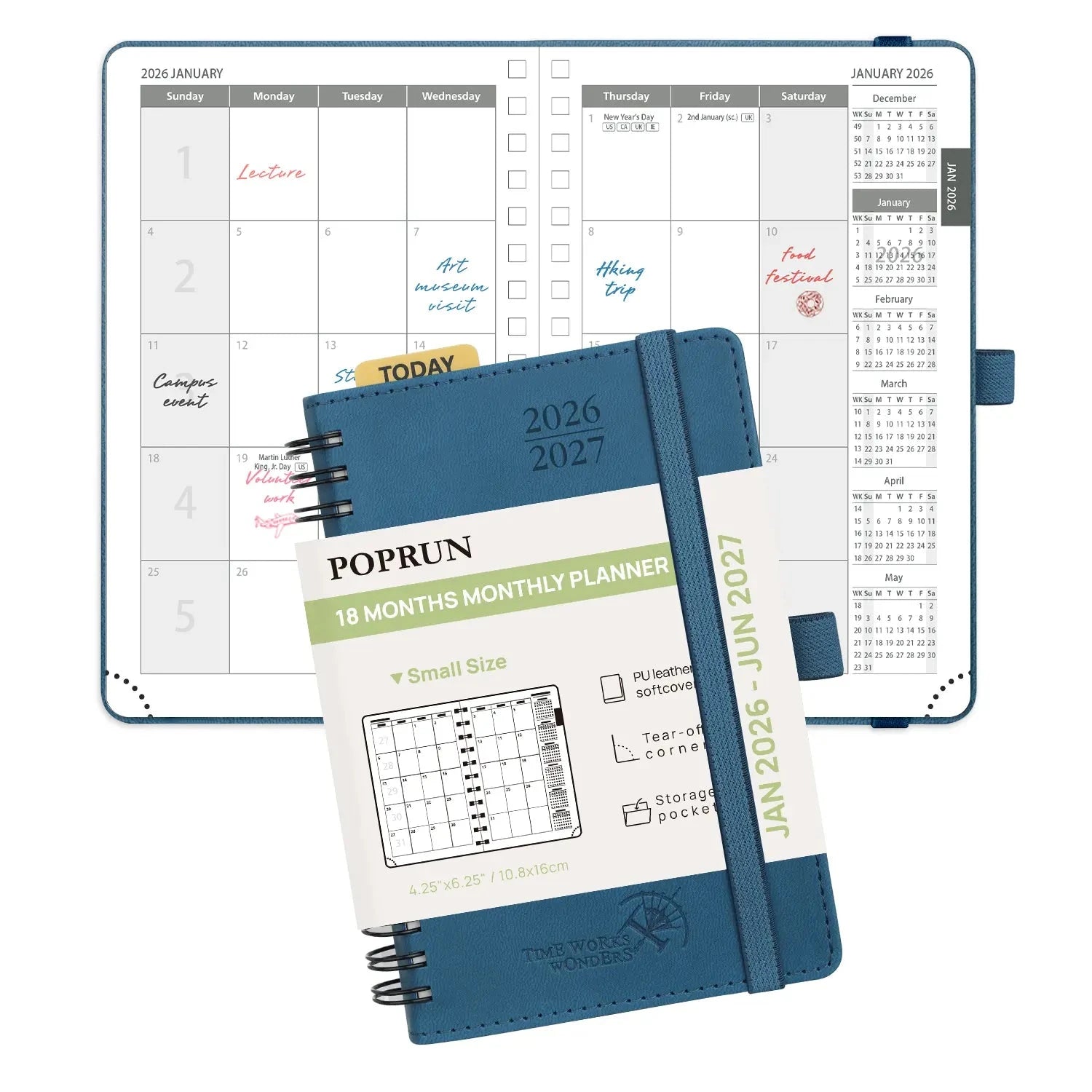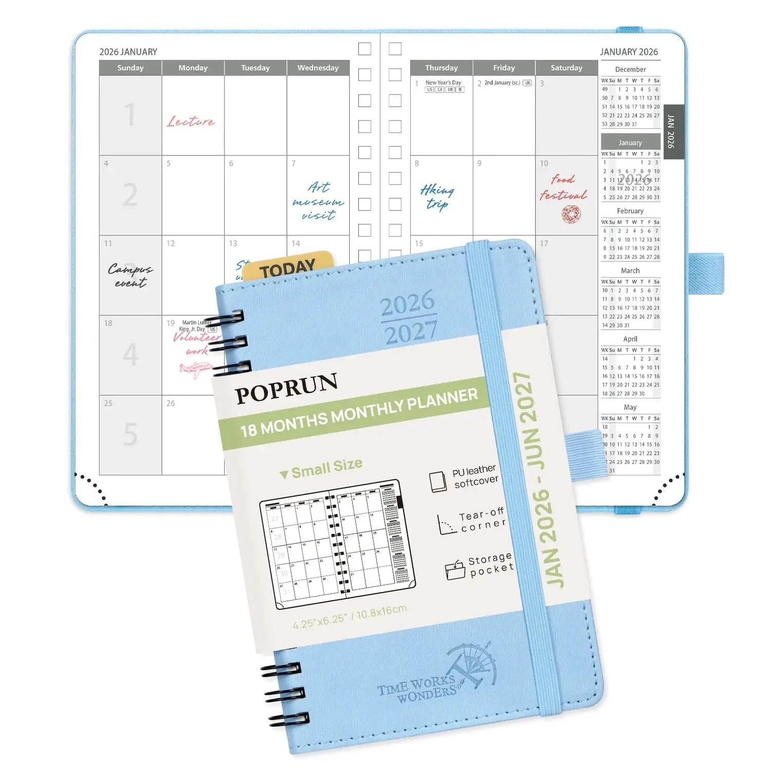 POPRUNย 18-Month Softcover Monthly Planner Keep your work and personal life in balance with our 18-month monthly planner. Covering January 2026 through June 2027, it provides a clear monthly layout to efficiently map out long-term goals, important tasks, and personal milestones. The monthly view offers a broad overview of your schedule, while the extended 18-month format ensures you can plan further ahead with confidence. Designed for busy professionals, students, and anyone managing multiple priorities, this planner helps you stay organized and in control every step of the way. Model: WEMLA6-26 Year: Jan.2026-Jun. 2027 Format: Monthly Cover: Soft Cover Binding: Spiral Size: 4.25×6.25ย in / 10.5×16 cm Layout: Vertical, 2 pages per month Bonus Features: Built-in โTodayโ ruler for easy measurement and drawing Paper Weight: The inner pages are 100gsm Plan further, dream bigger, and stay effortlessly on track with the POPRUN 18-Month Monthly Planner. Covering January 2026 through June 2027, this extended calendar gives you the clarity to map long-term goals, track important dates, and stay prepared for everything from daily deadlines to big milestones.