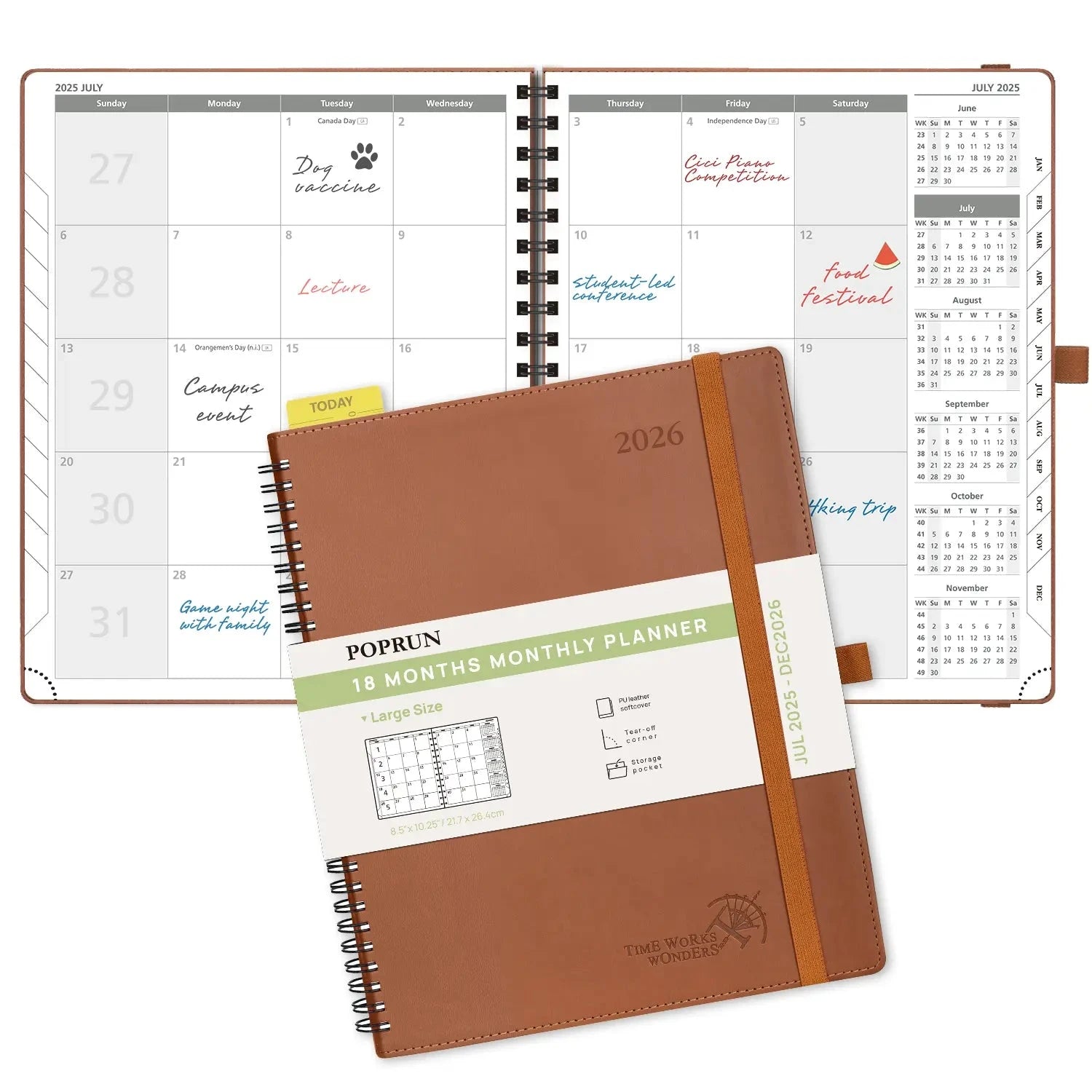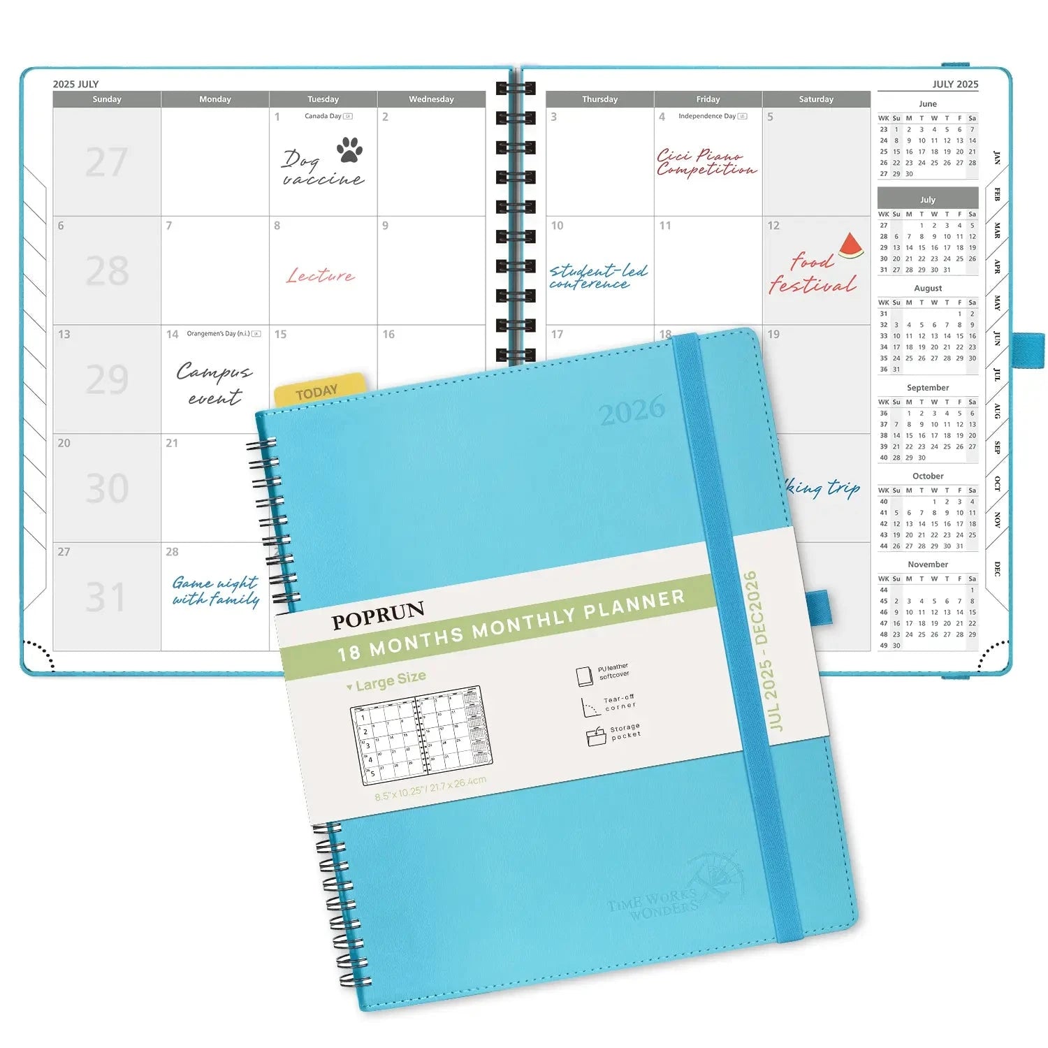 18 Month – Softcover Monthly Academic planner Stay organized throughout the 2025-2026 school year with our Monthly Academic Planner. Covering the months of July through December, this Large sized planner provides an 18-month overview to help you plan and stay on track with your studies and personal life. From setting long-term goals to managing monthly tasks, you can say goodbye to clutter and achieve effective time management. Take control of your academic progress now! Description Model: AWEMLK7-26 18-MONTH MONTHLY CALENDAR: The size is (8.5” X 10.5”), which permits large writting space. It is perfectly tailored for students to fit in with their school schedule. 4 PAGES PER MONTH: This 18-month planner (Jul.2025 – Dec.2026) presents a spacious and unique calendar-like design, each month has a 2-Page spread with dotted notes and an expense tracker to help you manage deadlines and goals effectively. QUICK SEARCH FUNCTION: Flexible ” TODAY ” Ruler and Monthly tabs allow you to quickly browse and locate the current date. Besides; the Tear-Off Corners and Bookmark Ribbons are added to mark any wanted page of your choice. EXTRA FUNCTION PAGES: This 2025 monthly planner also contains “2025-2026 Yearly Overview” Page + “2025-2026 Holiday & Calendar” Page + Monthly Expenses Page+ Contact & Password Pages + 7 Dotted Notes Pages for jotting down your ideas, thoughts or any other happy things in detail. Thick Paper: The use of premium 100GSM acid-free ivory paper, makes it silky smooth to write on and ink resistant, bringing you the ultimate writing experience FSC Certification: The use of ecological paper from sustainable forests and our compliance to European Community Regulation on chemicals and their safe use are our commitment to the environment