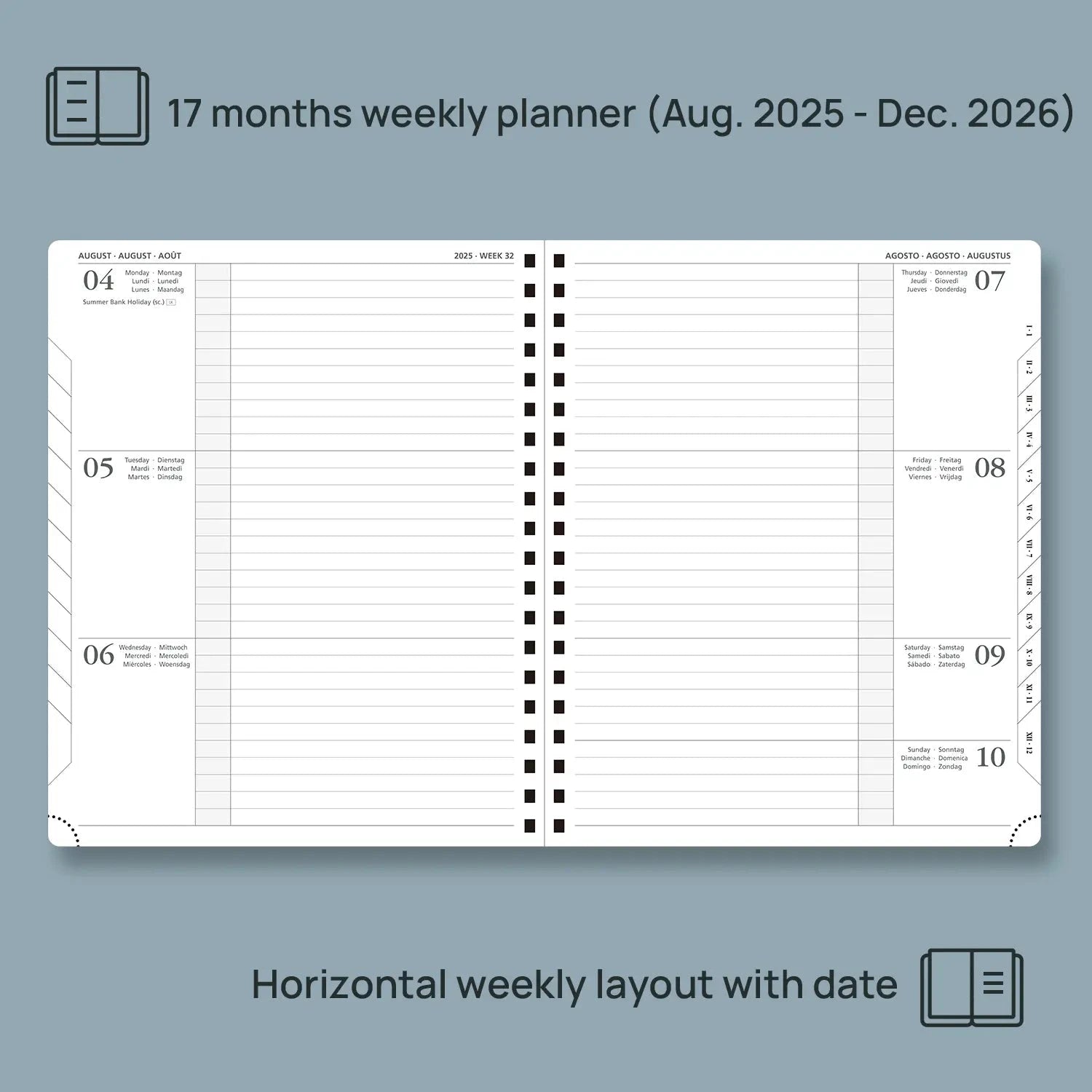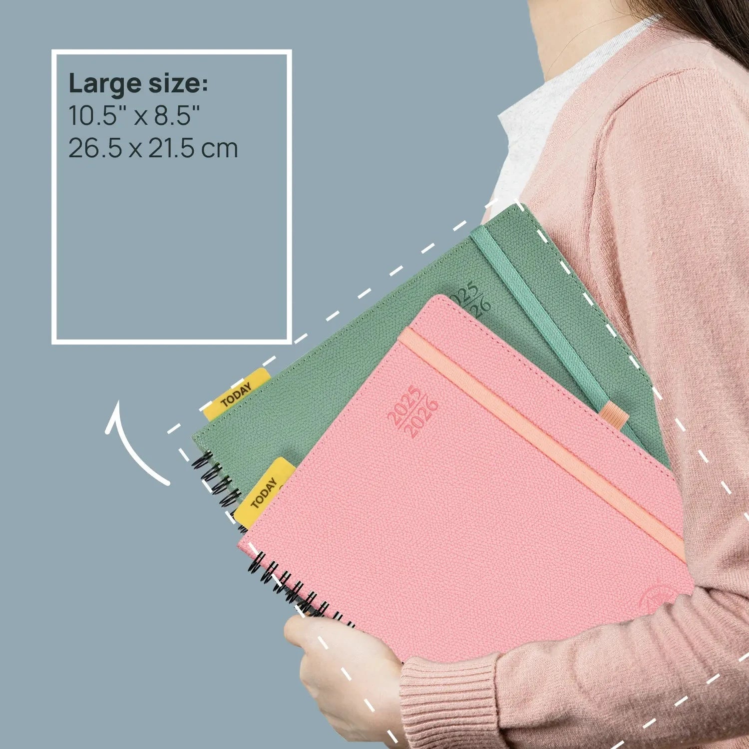 17 Month – Softcover Weekly Academic planner Stay organized with the POPRUN 2025–2026 Academic Planner — an 17-month organizer from August 2025 to December 2026. Perfect for back-to-school, semester planning, and long-term projects, it keeps students, professionals, and creatives focused with one continuous tool for success. Description Model: AW6TLK7-26 AUGUST 2025 – DECEMBER 2026 ACADEMIC PLANNER: This horizontal planner covers 17 month of 2025-2026 academic year with a large size (8.5” X 10.5”), which offers spacious writting space. It is perfectly tailored for students to fit in with their school schedule. HORIZONTAL WEEKLY LAYOUT WITH LINED PAGES: Starting from Monday to Sunday, this academic weekly planner offers 2 pages per week with lined notes pages for every date, which is used for spacious room to write to-do list. Besides, each month includes a monthly overview and dotted notes section on the right side before the weekly layout. BONUS FEATURES: The “TODAY” Ruler and Stair-like Monthly Tabs enable easy locating of the current date. Tear-Off Corners and Bookmark Ribbons are added to mark any page you want. The Elastic Closure ensures the planner securely closed, while the self-adhesive Pen holder holds your pen. Additionally, the Foldable Pocket offer a convenient space to store important documents. EXTRA FUNCTION PAGES: This weekly appointment book also contains “2025-2026 Yearly Overview” Pages + “2025-2026 Holiday & Calendar” Pages + Contact Pages + Password Pages + 10 Dotted Notes Pages, providing space for recording important information and enhancing organization. Thick Paper: The use of premium 100GSM acid-free ivory paper, makes it silky smooth to write on and ink resistant, bringing you the ultimate writing experience FSC Certification: The use of ecological paper from sustainable forests and our compliance to European Community Regulation on chemicals and their safe use are our commitment to the environment
