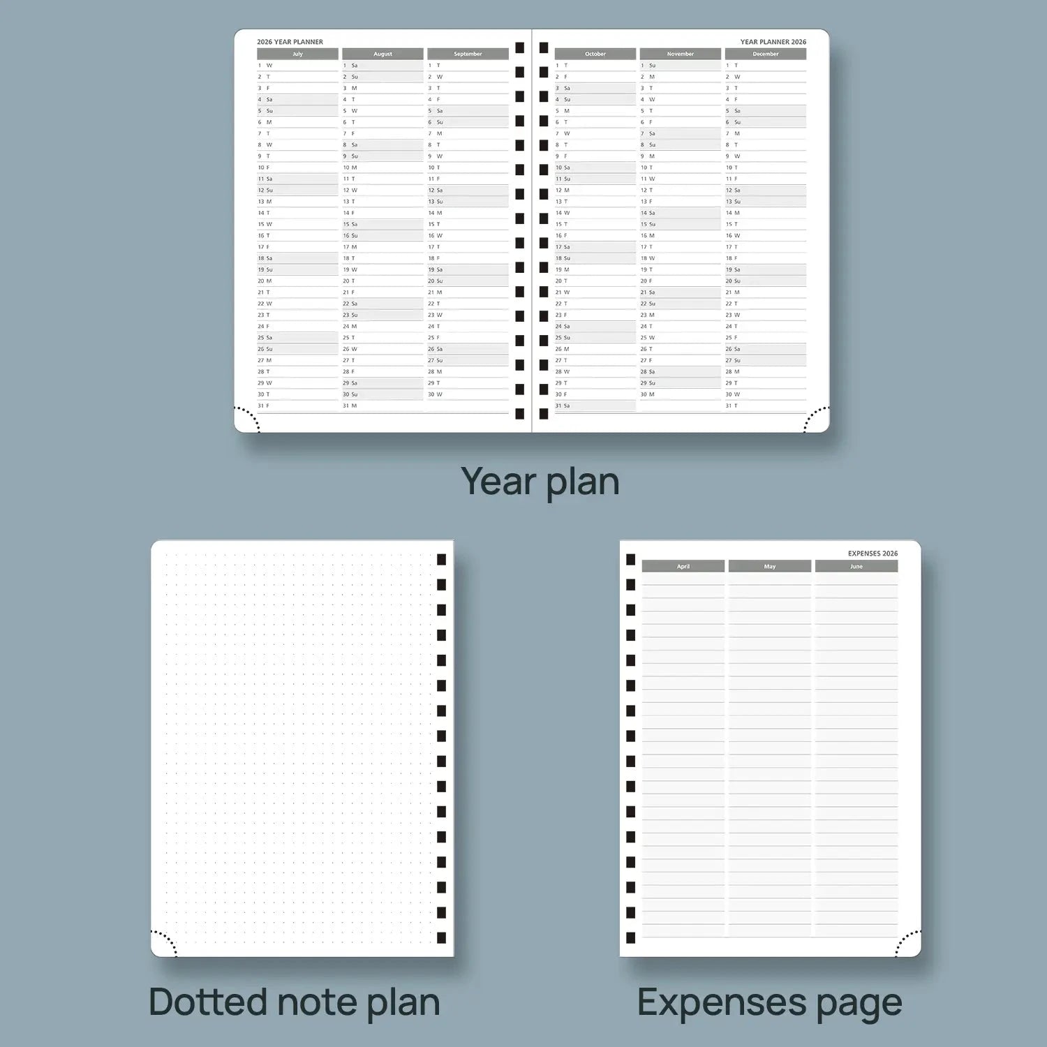 POPRUN 12 Month – Hardcover Weekly planner Experience a year of perfect planning with our 12-month planner. Designed to help you manage your daily tasks, long-term goals, and important matters, this planner offers monthly, daily, and weekly layouts to record meetings, tasks, and personal activities. Stay organized and in control with ease as you work, study, or live your life with this efficient and well-organized time management tool. Model: WEHA5-26 Year: Jan.-Dec. 2026 Format: Weekly Binding: Spiral Layout: Vertical, 2 pages per week Cover: Hard Cover Page Size: 8.5×6.25 in/21.5 cmx16 cm Bonus Features: Built-in “Today” ruler for easy measurement and drawing Paper Weight: The inner pages are 100gsm
