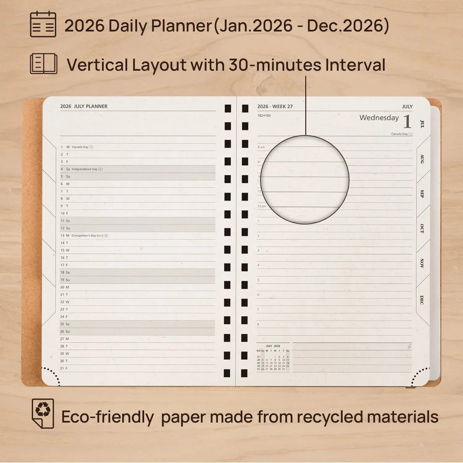 POPRUN 12-Month Hardcover Daily Planner Keep your work and personal life in balance with our 12-month daily planner. It features a clear daily layout that allows you to efficiently plan your daily tasks and goals, whether for work or personal matters. The day view gives you a quick overview of your daily to-do list, while the 12-month planner view helps to schedule long-term activities and goals. This planner is designed to keep you organized even with a busy schedule. Model: WERBTA5-26 Year: Jan.-Dec. 2026 Format: Daily Cover: Hard Cover Binding: Spiral Size: 6.5×8.5 in / 21.5×17.3 cm Layout: Vertical, 1 page per day Bonus Features: Built-in “Today” ruler for easy measurement and drawing Paper Weight: The inner pages are 100gsm Lifestyle InspirationImagine starting your morning with a calm coffee ritual, opening your POPRUN daily planner, and mapping out your day with intention. Whether it’s scheduling work calls, blocking out gym time, or journaling your best moments, this planner helps transform busy routines into mindful daily practices.