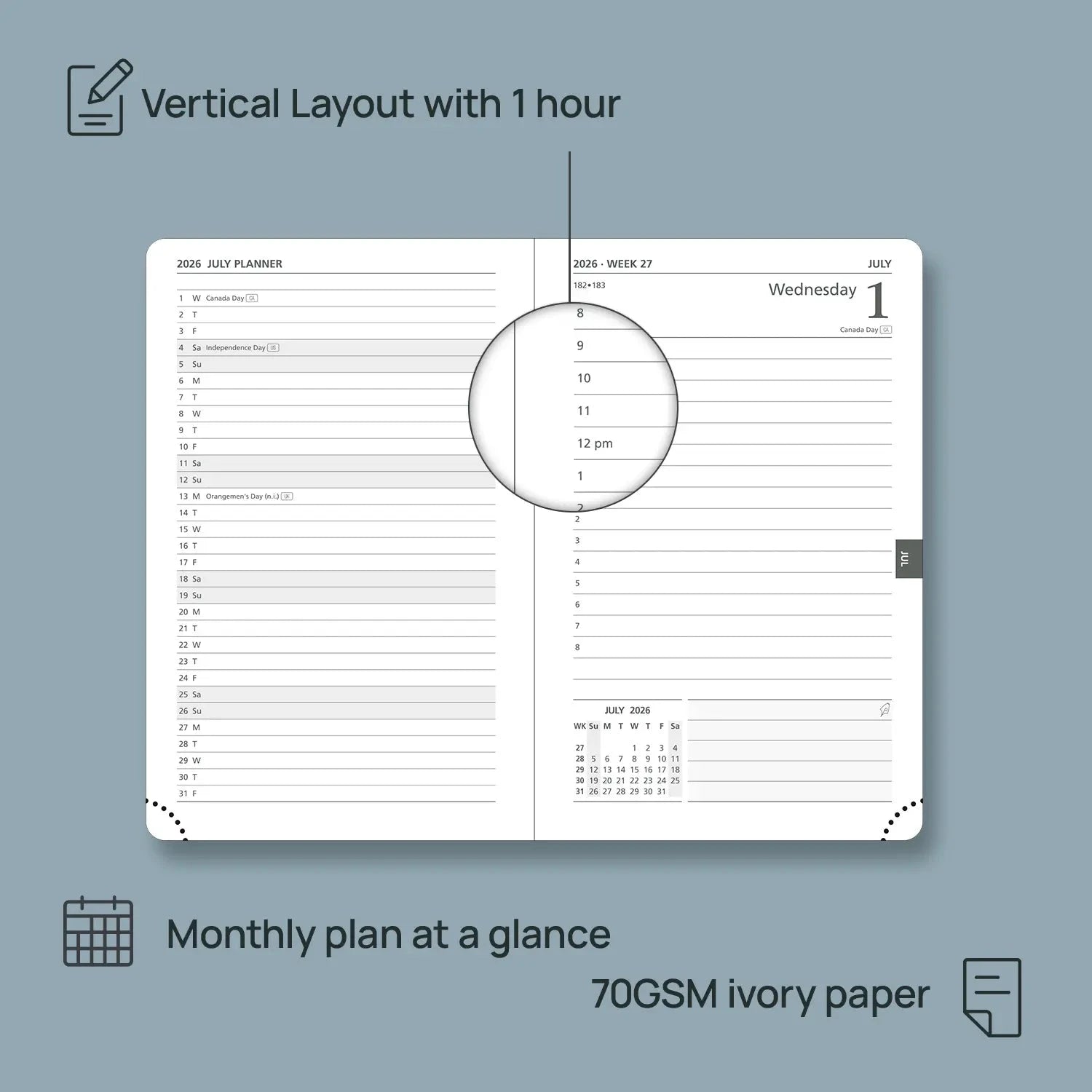 POPRUN 12 Month – Softcover Daily planner Keep your work and personal life in balance with our 12-month daily planner. It features a clear daily layout that allows you to efficiently plan your daily tasks and goals, whether for work or personal matters. The day view gives you a quick overview of your daily to-do list, while the 12-month planner view helps to schedule long-term activities and goals. This planner is designed to keep you organized even with a busy schedule. Model: CELBTA6-26 Year: Jan.-Dec. 2026 Format: Daily Binding: Casebound Layout: Vertical, 1 pages per Day Cover: Soft Cover Size: 4.25 x 6.25 in / 10.5×15.9 cm Paper Weight: The inner pages are 80gsm