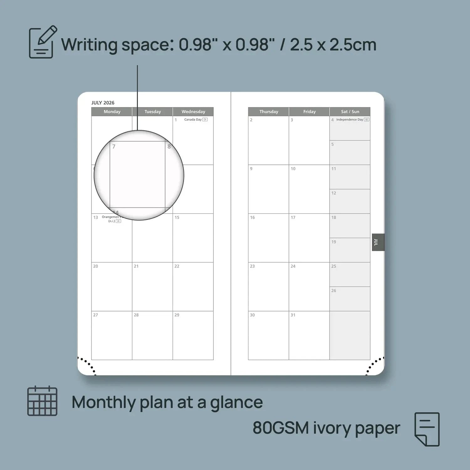 POPRUN 12 Month – Hardcover Weekly planner Experience a year of perfect planning with our 12-month planner. Designed to help you manage your daily tasks, long-term goals, and important matters, this planner offers monthly, daily, and weekly layouts to record meetings, tasks, and personal activities. Stay organized and in control with ease as you work, study, or live your life with this efficient and well-organized time management tool. Model: CELTP7-26 Year: Jan.-Dec. 2026 Format: Weekly Binding: Casebound Layout: Vertical, 2 pages per week Cover: Hard Cover Page Size: 6.5×3.5 in / 16.5×9 cm Paper Weight: The inner pages are 80gsm